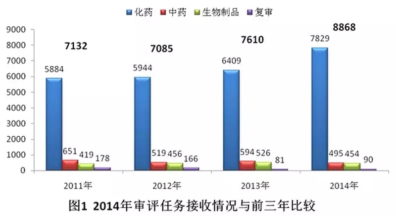 2014年,藥審中心接收新的注冊(cè)申請(qǐng)8868個(gè)(以受理號(hào)計(jì),下同)。與既往年度接收注冊(cè)申請(qǐng)的比較情況見圖1。
