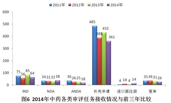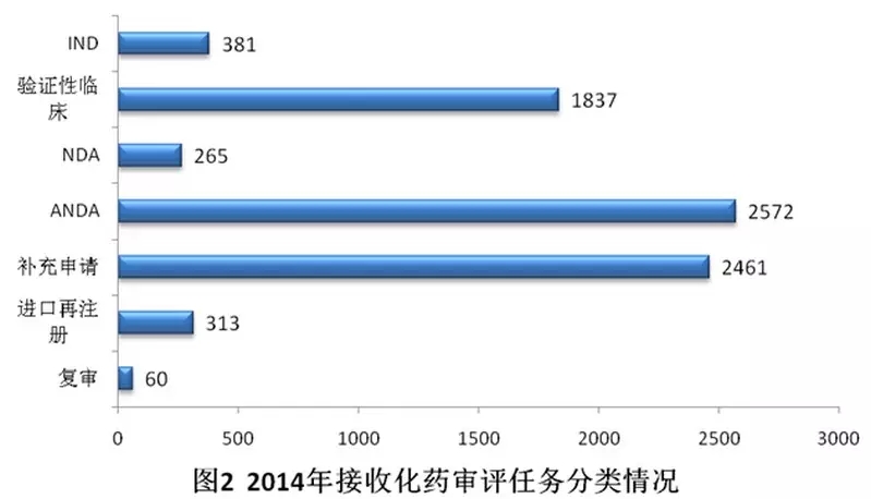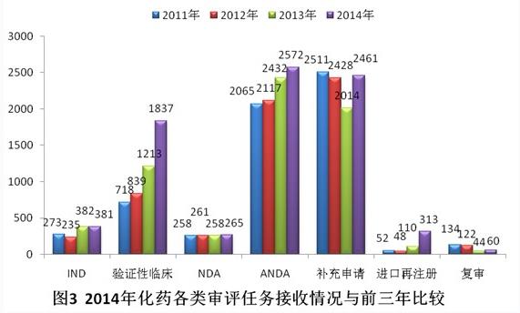 2014年化藥審評(píng)任務(wù)接收量增加明顯,較2011-2013年年均化藥審評(píng)任務(wù)接收量增幅近30%,占年度審評(píng)任務(wù)接收總量近90%;中藥和生物制品審評(píng)任務(wù)的接收量均有所下降。