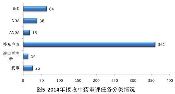 2014年共接收中藥注冊(cè)申請(qǐng)521個(gè),其中69.3%為補(bǔ)充申請(qǐng)。具體見圖5。