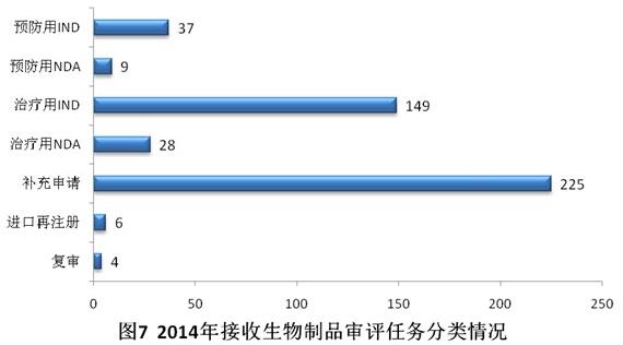 2014年共接收生物制品注冊(cè)申請(qǐng)458個(gè),其中補(bǔ)充申請(qǐng)占49.1%,治療用生物制品IND占32.5%。具體見圖7。