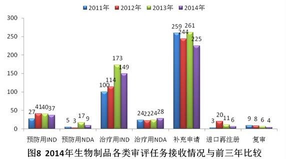 與2013年相比,2014年生物制品除治療用NDA外,其他各類審評(píng)任務(wù)接收量均有所下降。具體見圖8。
