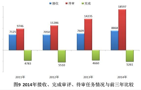 2014年,藥審中心共完成5261個(gè)注冊(cè)申請(qǐng)的技術(shù)審評(píng),比2013年的審評(píng)完成量增加了12.9%,但接收任務(wù)量較2013年增加了16.5%,待審任務(wù)積壓量進(jìn)一步增加。2014年接收、完成審評(píng)、待審任務(wù)情況與前三年比較見圖9。