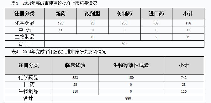 2014年,藥審中心完成審評(píng)建議國(guó)家總局批準(zhǔn)上市和批準(zhǔn)臨床研究的情況見表3、表4。