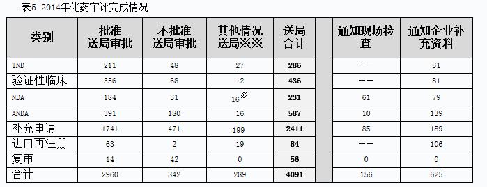 2014年化藥完成審評(píng)并呈送總局審批的注冊(cè)申請(qǐng)共4091個(gè),另有完成審評(píng)通知現(xiàn)場(chǎng)檢查的注冊(cè)申請(qǐng)156個(gè),完成審評(píng)通知企業(yè)補(bǔ)充資料的注冊(cè)申請(qǐng)625個(gè)。具體情況見表5。