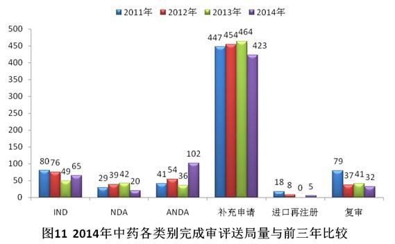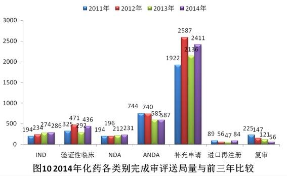 有明確審評(píng)結(jié)論的注冊(cè)申請(qǐng)中,建議批準(zhǔn)的2960個(gè),建議不批準(zhǔn)的842個(gè),總體不批準(zhǔn)率為22.1%。與2013年比較,2014年化藥除復(fù)審?fù)飧黝悇e完成審評(píng)送局量均有所增加。2014年化藥各類別完成審評(píng)送局量與前三年比較情況見圖10。