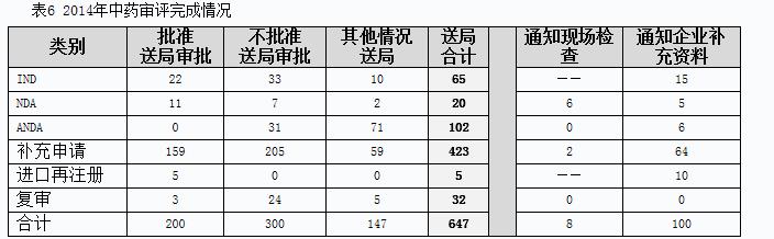 2014年中藥完成審評(píng)并呈送總局審批的注冊(cè)申請(qǐng)共647個(gè),另有完成審評(píng)已通知現(xiàn)場(chǎng)檢查的注冊(cè)申請(qǐng)8個(gè),完成審評(píng)通知企業(yè)補(bǔ)充資料的注冊(cè)申請(qǐng)100個(gè)。具體情況見表6。