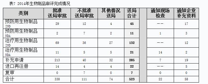 2014年完成生物制品審評(píng)并呈送總局審批的注冊(cè)申請(qǐng)共523個(gè),另有完成審評(píng)已通知現(xiàn)場(chǎng)檢查的注冊(cè)申請(qǐng)22個(gè),完成審評(píng)通知企業(yè)補(bǔ)充資料的注冊(cè)申請(qǐng)58個(gè)。具體情況見表7。