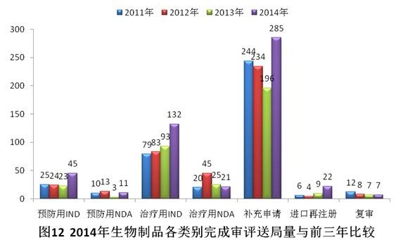 有明確審評(píng)結(jié)論的注冊(cè)申請(qǐng)中,批準(zhǔn)結(jié)論338個(gè),不批準(zhǔn)結(jié)論111個(gè),總體不批準(zhǔn)率為24.7%。2014年生物制品各類別完成審評(píng)送局量與前三年比較情況見圖12。