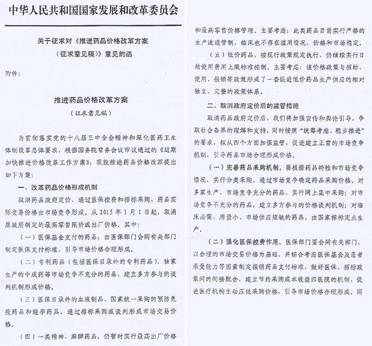 據(jù)悉2014年11月25日,國家發(fā)改委向8個行業(yè)協(xié)會下發(fā)了關(guān)于征求對《推進藥品價格改革方案(征求意見稿)》意見的函。在此之前發(fā)改委藥品價改方案已經(jīng)多方意見征求,征求對象包括地方物價系統(tǒng)、衛(wèi)計委及人社部等相關(guān)政府部門。