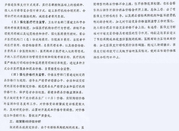 取消藥品政府定價后,由于有招標采購機制約束,醫(yī)院銷售藥品價格不會上漲。但不排除改革初期,零售藥店銷售部分藥品價格會有所上漲。總體來看,由于有醫(yī)保支付標準引導(dǎo),以及招標采購機制和醫(yī)??刭M機制綜合制約(價格放開后未來主要價格管理應(yīng)由衛(wèi)計委和醫(yī)保部門負責),加之對市場交易價格監(jiān)測監(jiān)管強化(物價部門主要職責是加強市場監(jiān)管)。絕大部分藥品市場交易價格不會上漲。長遠看醫(yī)保支付標準對市場交易價格有較強引導(dǎo)作用。特別是建立節(jié)約采購成本收益歸醫(yī)院機制,醫(yī)院有動力壓低藥價,加之醫(yī)保支付標準實時動態(tài)調(diào)整,經(jīng)過幾輪(壓價)調(diào)整后,醫(yī)保支付標準就可以反映市場真實情況。使藥品市場價格保持在合理水平上。