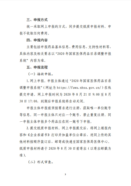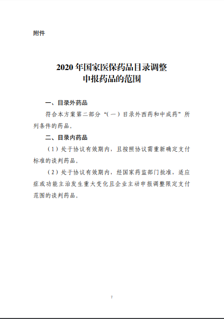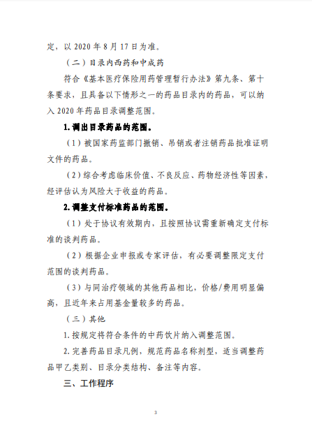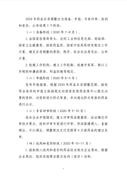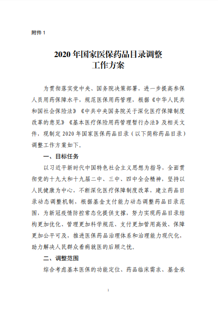 2020年8月3日-10日,國(guó)家醫(yī)療保障局就《2020年國(guó)家醫(yī)保藥品目錄調(diào)整工作方案(征求意見(jiàn)稿)》向社會(huì)公開(kāi)征求了意見(jiàn)。8月17日,《2020年國(guó)家醫(yī)保藥品目錄調(diào)整工作方案》和《2020年國(guó)家醫(yī)保藥品目錄調(diào)整申報(bào)指南》正式公布。